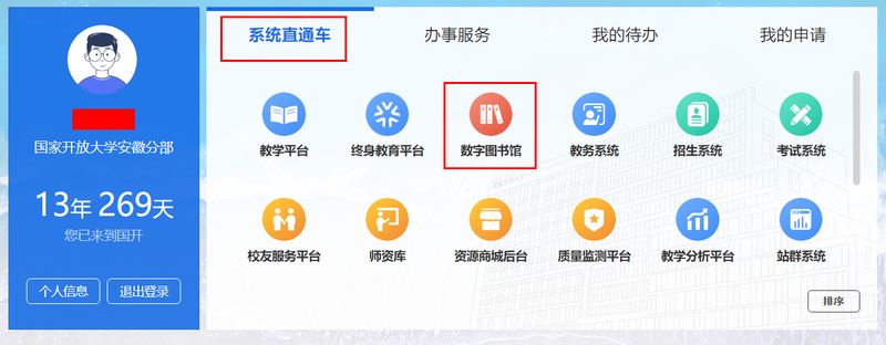 登录一网一平台,点击“系统直通车”标签中的“数字图书馆”,进入图书馆主页,如下图所示。